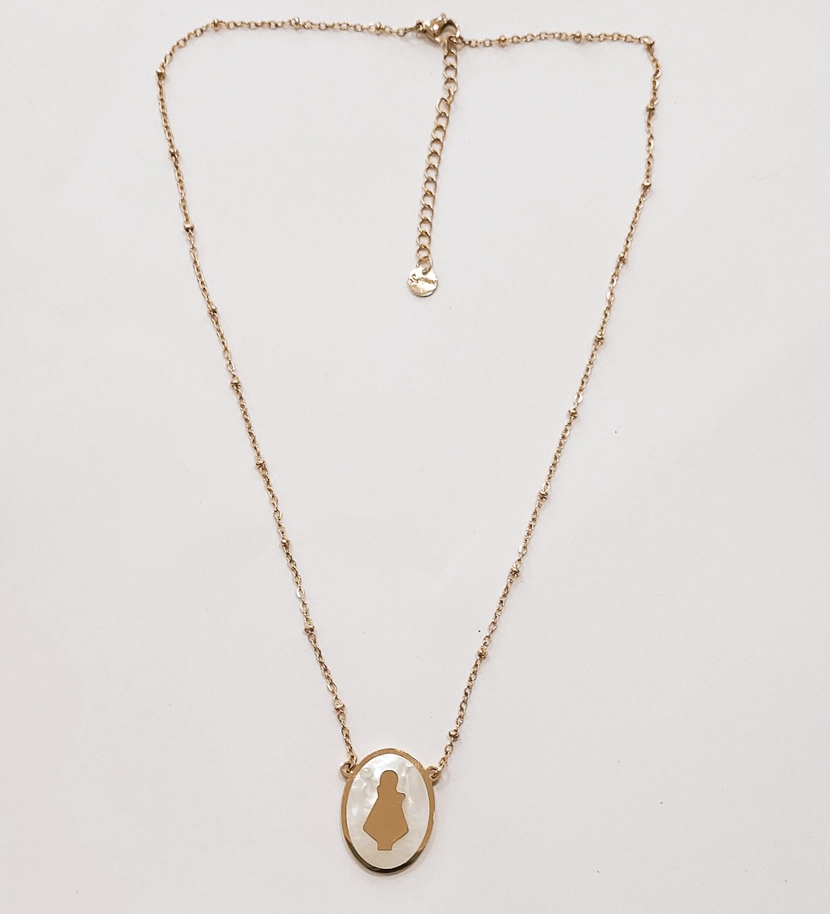 Medalla de la Virgen de Covadonga en acero dorado y nácar. Incluye cadena también en acero dorado con una longitud de 45 cm aproximadamente más un añadido 5 cm extra para adaptar a tu gusto. Perfecta para combinar con otras cadenas o bien lucir en solitario.