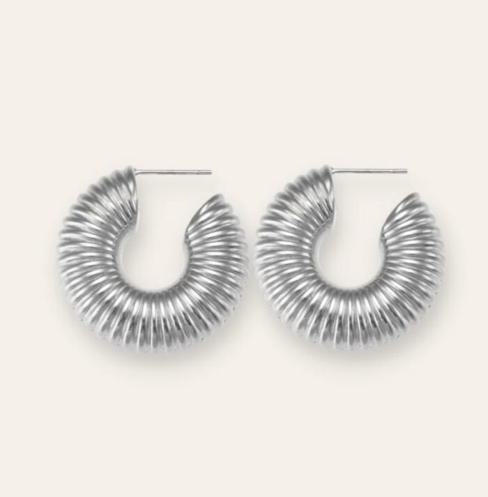Pendientes de acero dorado o plateado cuya forma recuerda a la del caracol. A pesar de ser gruesos no pesan porque son huecos, asi que resultan comodísimos y adecuados para ocualquier ocasión.